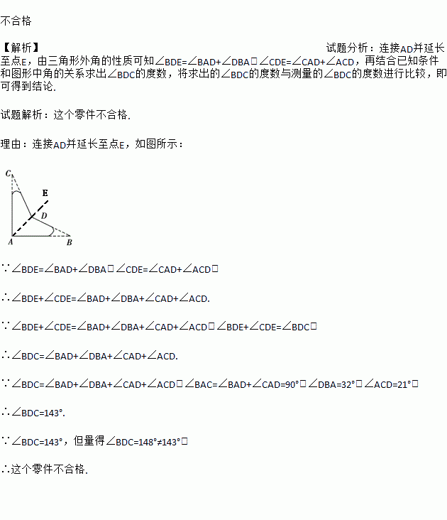 一个零件的形状如图,按规定∠A=90°,∠B和∠C应分别是32°和21°,检验工人量得∠BDC=148°,断定这个零件是否合格?为什么?