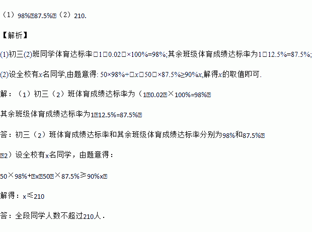 (2)如果全段同学的体育达标率不低于90%,则全段同学人数不超过多少人?