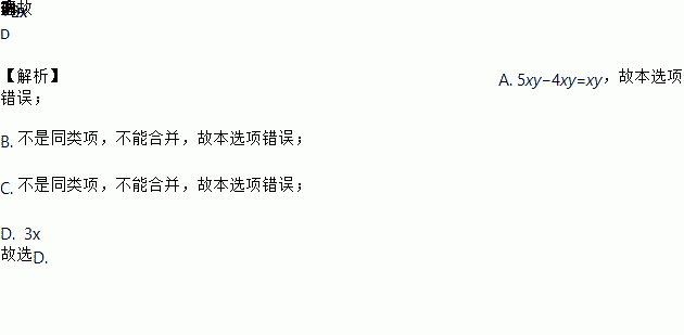 A. 5xy-4xy=1 B. 3x2+2x3=5x5 C. x2-x=x D. 3x2+2x2=5x2