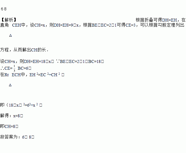 如图,正方形的边长为18,将正方形折叠,使顶点落在边上的点处,折痕为.若,则线段=________,=________.