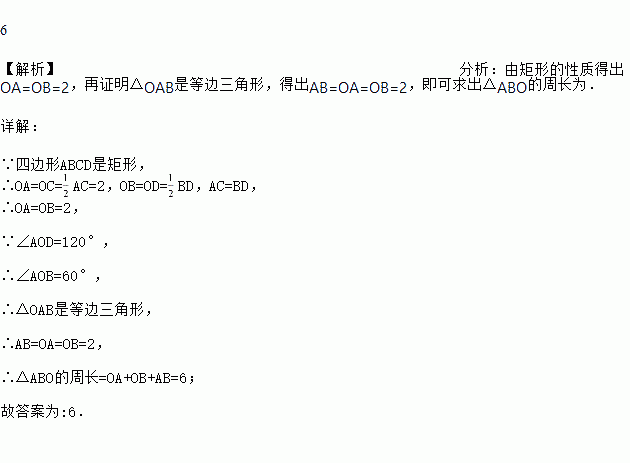 矩形ABCD的对角线AC、BD交于点O,∠AOD=120°,AC=4,则△ABO的周长为_______.