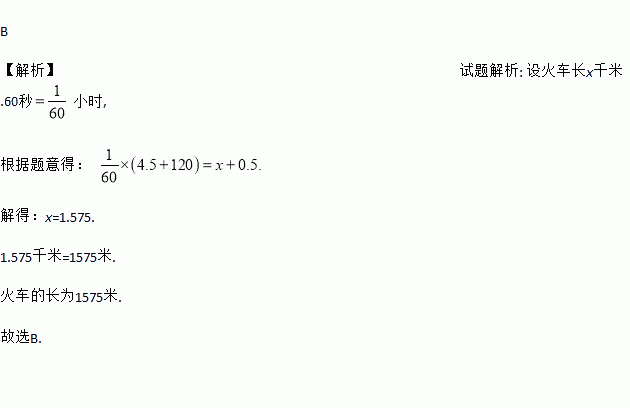 某中学学生军训,沿着与笔直的铁路并列的公路匀速前进,每小时走4500米。一列火车以每小时120千米的速度迎面开来,测得火车头与队首学生相遇,到车尾与队末学生相遇,共经过60秒。如果队伍长500米,那么火车长( )