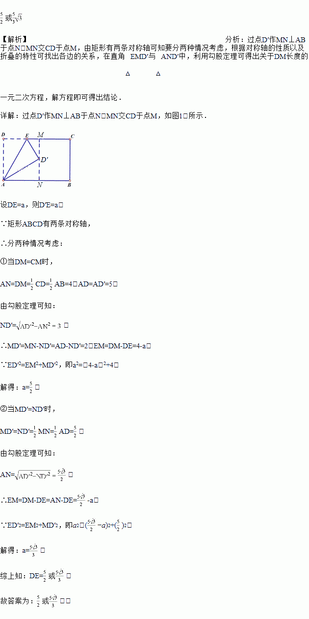 如图,矩形ABCD中,AB=8,AD=5,点E为DC边上一个动点,把△ADE沿AE折叠,点D的对应点D’落在矩形ABCD的对称轴上时,DE的长为____________.