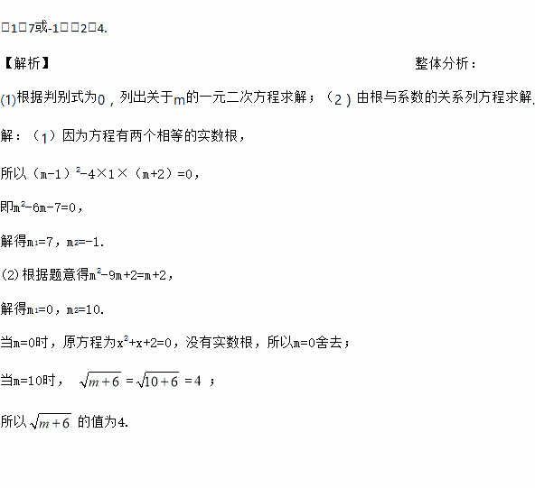 (1)若方程有两个相等的实数根,求的值;