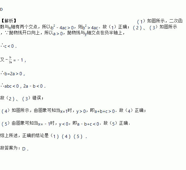 已知二次函数y=ax2+bx+c(a≠0)的图象如图,其对称轴为直线x=﹣1,给出下列结果:(1)b2>4ac;(2)abc>0;(3)2a+b=0;(4)a+b+c>0;(5)a﹣b+c<0.