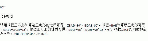 如图,在正方形 ABCD 外侧,作等边三角形 ADE,AC,BE 相交于点 F,则∠BFC 为______度.