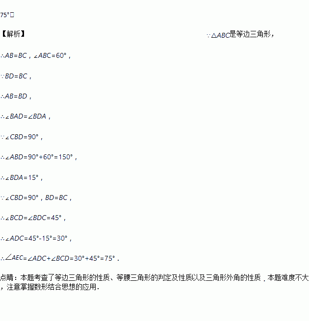 如图,△ABC是等边三角形,∠CBD=90°,BD=BC,连接AD交BC于点E,则∠AEC的度数是_________.