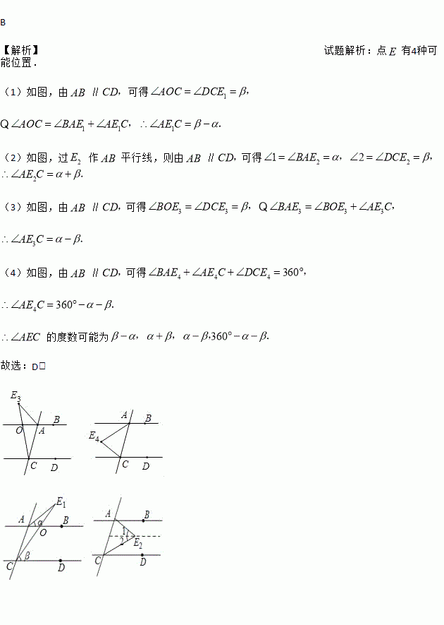 如图,已知直线AB、CD被直线AC所截,AB∥CD,E是平面内任意一点(点E不在直线AB、CD、AC上),设∠BAE=α,∠DCE=β.下列各式:①α+β,②α﹣β,③180°﹣α﹣β,,④360°﹣α﹣β,∠AEC的度数可能是( )