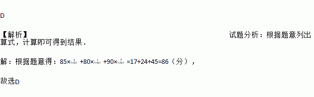 小王参加某企业招聘测试,他的笔试、面试、技能操作得分分别为85分、80分、90分,若依次按照2:3:5的比例确定成绩,则小王的成绩是( )