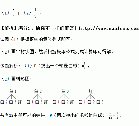 从袋子中随机摸出一个球,不放回袋子,摇匀袋子后再摸一个球,请用列表或画树状图的方法,求出两次摸出的球都是白球的概率.![]()