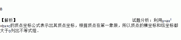 B 【解析】试题分析:利用y=ax2+bx+c的顶点坐标公式表示出其顶点坐标,根据顶点在第一象限,所以顶点的横坐标和纵坐标都大于0列出不等式组.