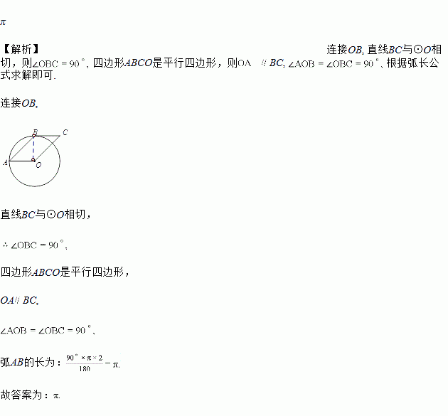 如图,⊙O经过□ABCO的顶点A、B.若直线BC与⊙O相切,⊙O的半径为2,则