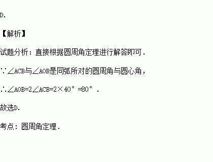 如图,A、B、C是⊙O上的三点,若∠C=40°,则∠AOB的度数是 ( )