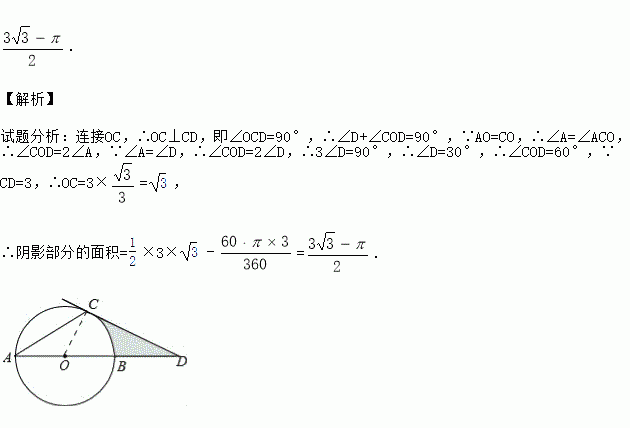 如图,AB是⊙O的直径,AC是⊙O的弦,过点C的切线交AB的延长线于点D,若∠A=∠D,CD=3,则图中阴影部分的面积为 .