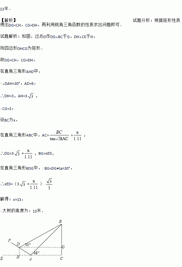 如图所示,某数学活动小组选定测量小河对岸大树BC的高度,他们在斜坡上D处测得大树顶端B的仰角是30º,朝大树方向下坡走6米到达坡底A处,在A处测得大树顶端B的仰角是48°. 若坡角∠FAE=30°,求大树的高度. (结果保留整数,参考数据:sin48°≈0.74,cos48°≈0.67,tan48°≈1.11,
