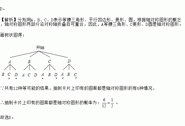 (2013年四川自贡4分)在四张背面完全相同的卡片上分别印有等腰三角形、平行四边形、菱形、圆的图案,现将印有图案的一面朝下,混合后从中随机抽取两张,则抽到卡片上印有的图案都是轴对称图形的概率为【 】