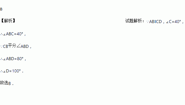 如图,AB∥CD,CB平分∠ABD.若∠C=40°,则∠D的度数为( )