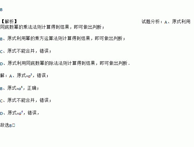 A. a•a2=a2 B. (a2)3=a6 C. a2+a3=a6 D. a6÷a2=a3