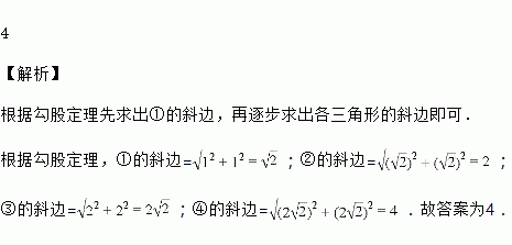 如图所示的图形由4个等腰直角形组成,其中直角三角形(1)的腰长为1cm,则直角三角形(4)的斜边长为__.