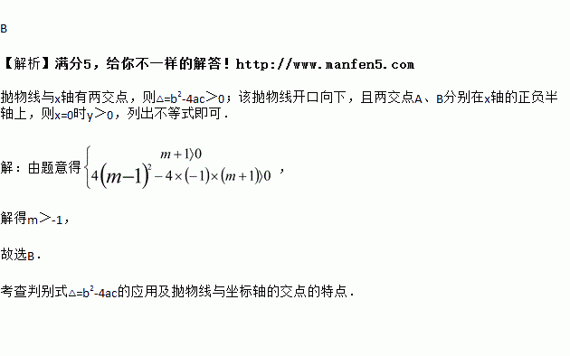 如果抛物线y=-x2+2(m-1)x+m+1与x轴交于A、B两点,且A点在x轴正半轴上,B点在x轴的负半轴上,则m的取值范围应是( )