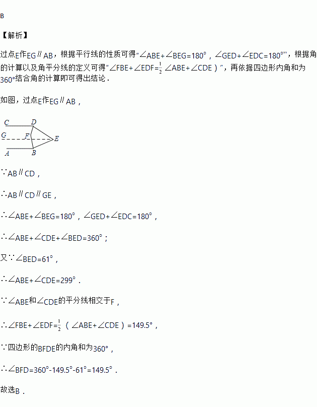 如图,AB∥CD,∠BED=61°,∠ABE的平分线与∠CDE的平分线交于点F,则∠DFB=( )