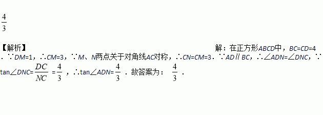 如图,正方形ABCD的边长为4,点M在边DC上,M、N 两点关于对角线AC对称,若DM=1,则tan∠ADN=__________.