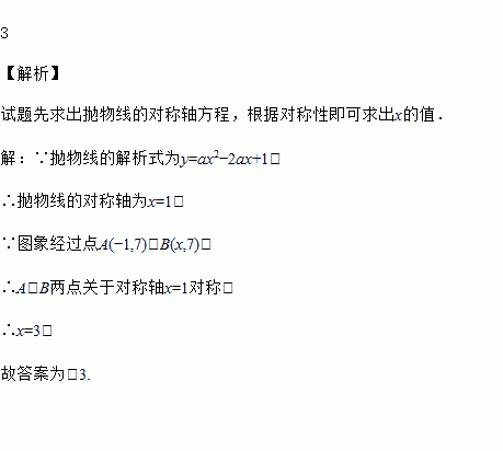 如果抛物线y=ax2﹣2ax+1经过点A(﹣1,7)、B(x,7),那么x=_____.