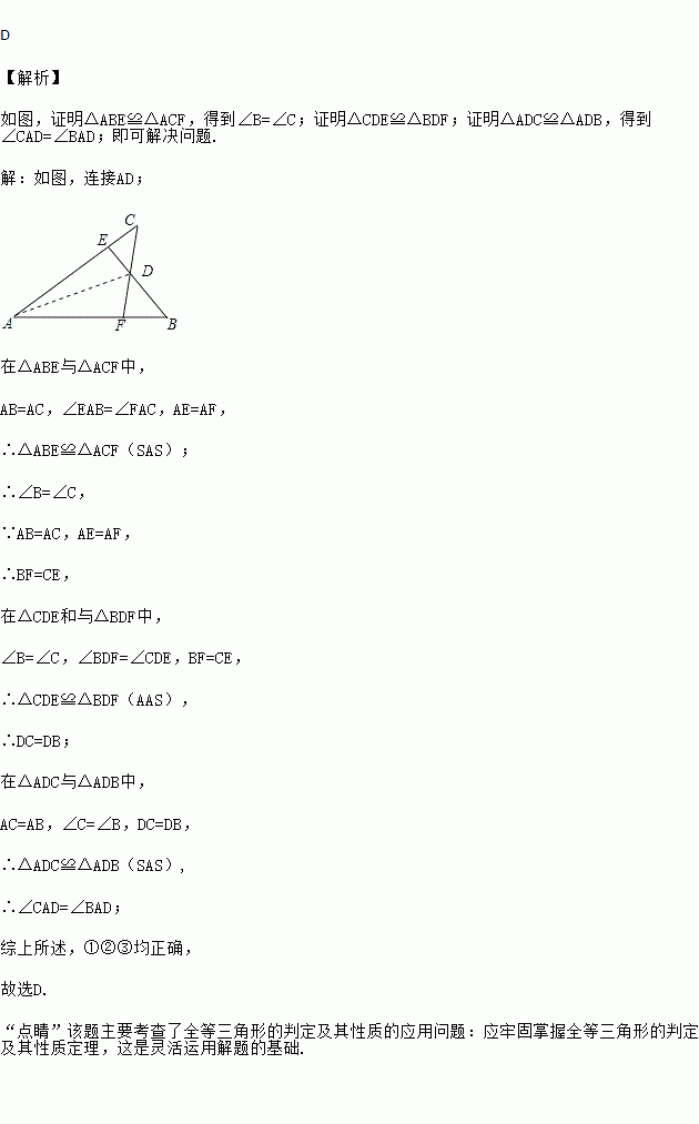 如图,已知AB=AC,AE=AF,BE与CF交于点D,则对于下列结论:①△ABE≌△ACF;②△BDF≌△CDE;③D在∠BAC的平分线上.其中正确的是( )
