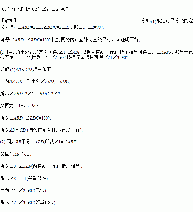 如图所示,∠ABD和∠BDC的平分线相交于点E,BE交CD于点F, ∠1+∠2=90°.