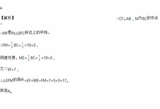 如图,在△ABC中,CF⊥AB于F,BE⊥AC于E,M为BC的中点,EF=7,BC=10,则△EFM的周长是( )