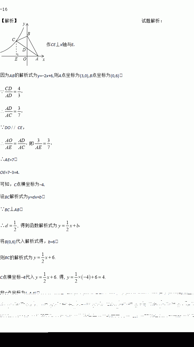 如图,直线y=﹣2x+6与坐标轴相交于点A、点B,BC⊥AB,且=,双曲线y=过点C,则k=_____.