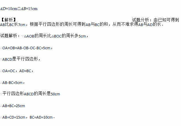 已知:平行四边形ABCD的周长为50 cm,对角线AC、BD相交于点O,△AOD的周长比△BOA的周长长5 cm,求这个平行四边形各边的长.