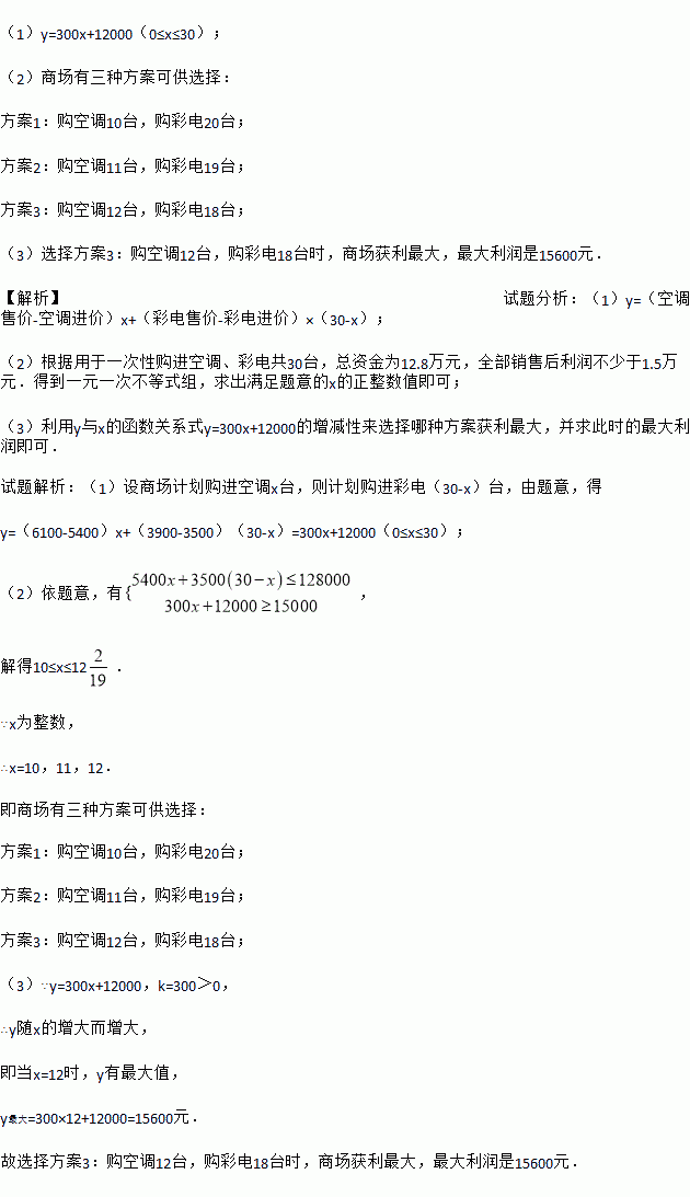 某商场筹集资金12.8万元,一次性购进空调、彩电共30台.根据市场需要,这些空调、彩电可以全部销售,全部销售后利润不少于1.5万元,其中空调、彩电的进价和售价见表格.