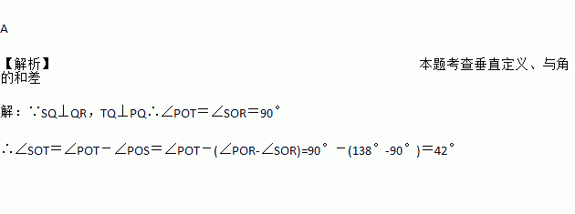 如图,∠PQR等于138°,SQ⊥QR,TQ⊥PQ则∠SQT等于( )