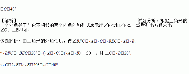 如图,点E在AC上,点F在AB上,BE,CF交于点O,且∠C=2∠B,∠BFC-∠BEC=20°,求∠C的度数.