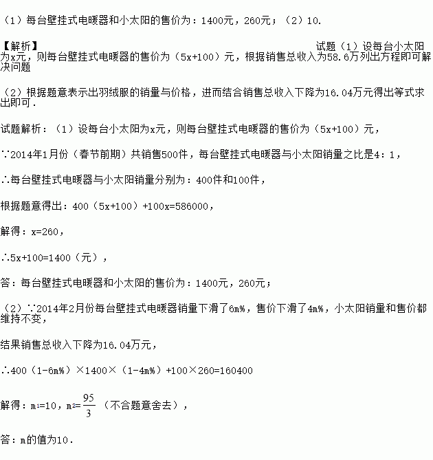 (2)随着“元旦、春节”双节的来临和气温的回升,销售进入淡季,2017年1月份,壁挂式电暖器的售价比2016年12月下调了4m﹪,根据经验销售量将比2016年12月下滑6m﹪,而“小太阳”的销售量和售价都维持不变,预计销售总收入将下降到16.04万元,求m的值.