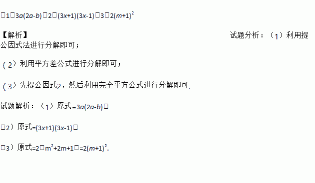 (1)3a(2a-b)(2)(3x+1)(3x-1)(3)2(m+1)2 【解析】试题分析:(1)利用提公因式法进行分解即可; (2)利用平方差公式进行分解即可; (3)先提公因式2,然后利用完全平方公式进行分解即可. 试题解析:(1)原式=3a(2a-b); (2)原式=(3x+1)(3x-1); (3)原式=2(m2+2m+1)=2(m+1)2. ...