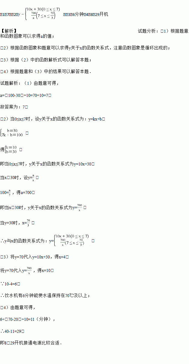 (4)若饮水机早上已加满水,开机温度是20℃,为了使8:40下课时水温达到70℃及以上,并节约能源,直接写出当它上午什么时间接通电源比较合适?