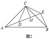 如图2,△ACB和△DCE均为等腰直角三角形,∠ACB=∠DCE=90°点A、D、E在同一直线上,CM为△DCE中DE边上的高,连接BE,请判断∠AEB的度数及线段CM、AE、BE之间的数量关系,并说明理由.
