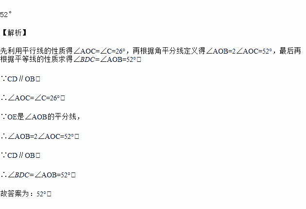 如图,OC是∠AOB的平分线,且CD∥OA,∠C=26°,则∠BDC的度数等于___.
