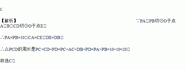 如图,PA、PB切⊙O于点A、B,PA=10,CD切⊙O于点E,交PA、PB于C、D两点,则△PCD的周长是( )