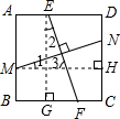 cm.分析:过点E作EG⊥BC于G,过点M作MH⊥CD于H,根据正方形的性质可得EG=MH,EG⊥MH,再根据同角的余角相等求出∠1=∠2,然后利用“角边角”证明△EFG和△MNH全等,根据全等三角形对应边相等证明即可.