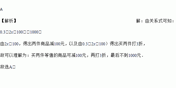 A. 买两件等值的商品可减100元,再打3折,最后不到1000元