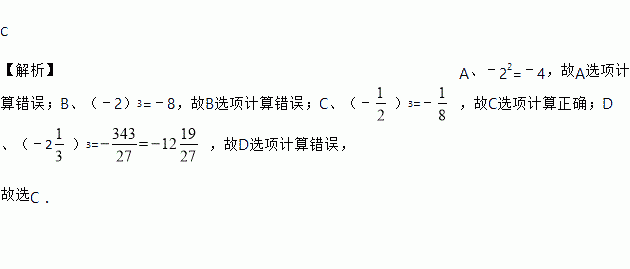 A. ﹣22=4 B. (﹣2)3=﹣6 C. (﹣)3=﹣ D. (﹣2)3=﹣8