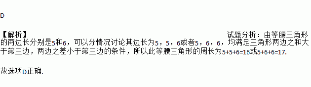 已知等腰三角形的两边长分别是5和6,则这个等腰三角形的周长为( ).
