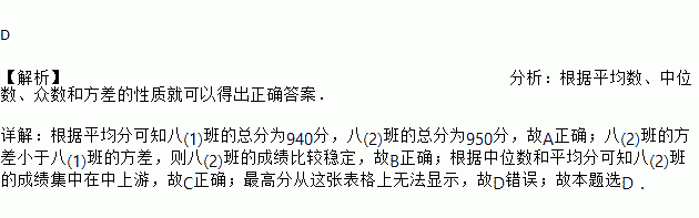 A. 八(2)班的总分高于八(1)班 B. 八(2)班的成绩比八(1)班稳定