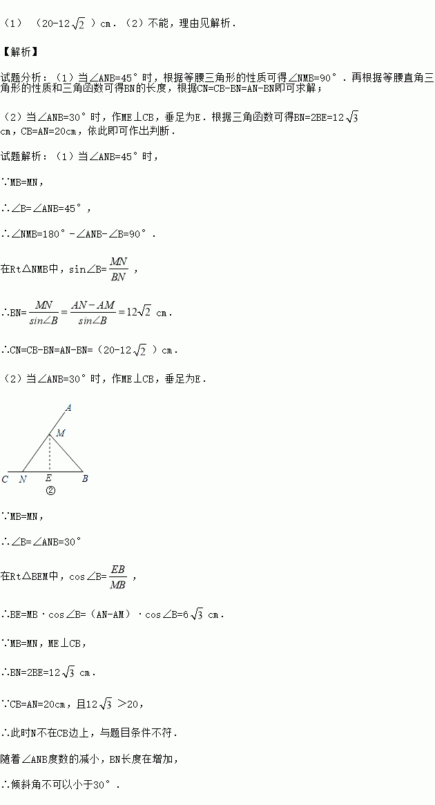 (1) (20-12)cm.(2)不能,理由见解析. 【解析】 试题分析:(1)当∠ANB=45°时,根据等腰三角形的性质可得∠NMB=90°.再根据等腰直角三角形的性质和三角函数可得BN的长度,根据CN=CB-BN=AN-BN即可求解; (2)当∠ANB=30°时,作ME⊥CB,垂足为E.根据三角函数可得BN=2BE=12cm,CB=AN=20cm,依此即可作出判断. 试...