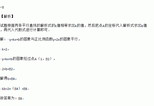如图,一次函数y=kx+b的图象与正比例函数y=2x的图象平行,且经过点A(1,﹣2),则kb=__.