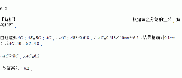 如图是一种贝壳从上面看得到的图形,点C分线段AB近似于黄金分割(AC>BC).已知AB=10 cm,则AC的长约为________cm(结果精确到0.1 cm).