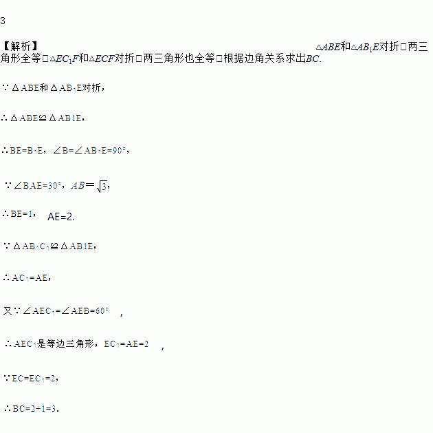 将矩形纸片ABCD按如图所示的方式折叠,AE、EF为折痕,∠BAE=30°,AB=,折叠后,点C落在AD边上的C1处,并且点B落在EC1边上的B1处.求 BC的长.